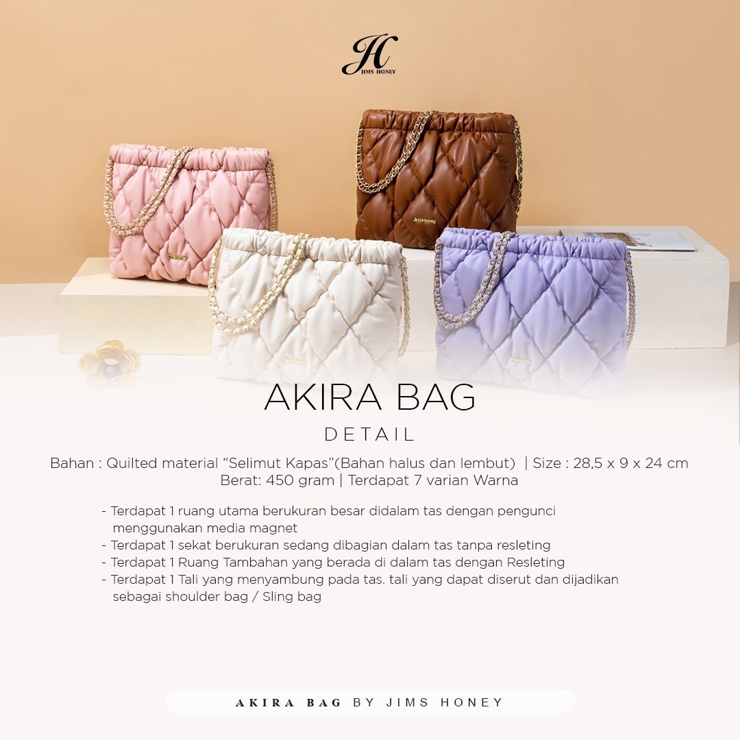 JHLadie pernah gak sih membayangkan memiliki tas yang senyaman bantal favorit kamu? Kini, impian tersebut menjadi kenyataan dengan koleksi tas empuk dari JIMS HONEY kami! Dirancang khusus untuk memberikan kenyamanan maksimal, Akira Bag ini memberikan sensasi lembut dan empuk setiap kali JHLadies membawanya. Sempurna untuk menemani aktivitas sehari-hari Anda dengan gaya dan kenyamanan yang tak tertandingi.