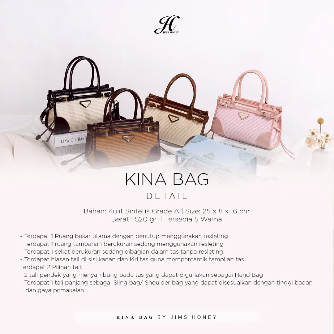 Hadir dengan desain elegan dan sentuhan timeless, KINA Bag dari Jims Honey siap melengkapi gaya fashion kamu! Tas ini dirancang khusus untuk kamu yang menyukai tampilan klasik namun tetap stylish di setiap kesempatan.
