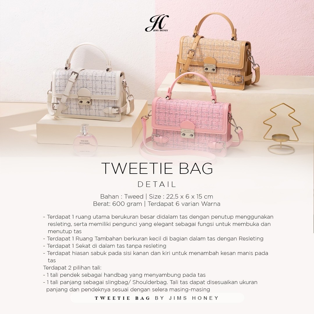 Selain keindahannya, tweetie bag juga menawarkan fungsionalitas yang tak tertandingi. Material tweed yang kuat memastikan barang-barang JHLadies terlindungi dengan baik, sementara compartment yang luas dirancang untuk menampung semua kebutuhan harian kamu. Dengan berbagai pilihan warna, tas ini siap menjadi pernyataan mode kamu sepanjang hari